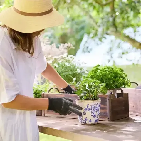 A delightful garden pot embellished with a vintage blue and white floral pattern evokes a sense of nostalgia and pastoral charm. Whether planted with vibrant flowers, or kitchen herbs, this planter is sure to bring joy and beauty to any garden or outdoor space.
