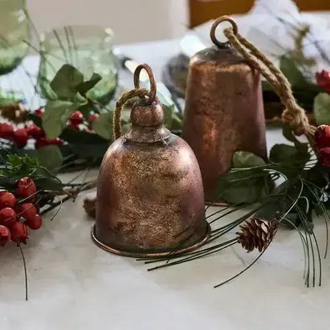 Festive antique bronze bell can be displayed with a foraged wreath or placed on a hook or door handle around the home to create an inviting atmosphere.