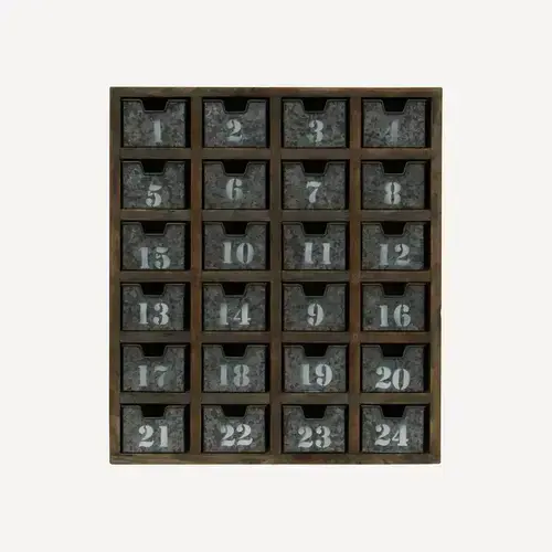 Rustic wall shelf with galvanised steel draws. Each draw is numbered 1-25 and can be used as an advent calendar or all year round as a rustic storage solution.