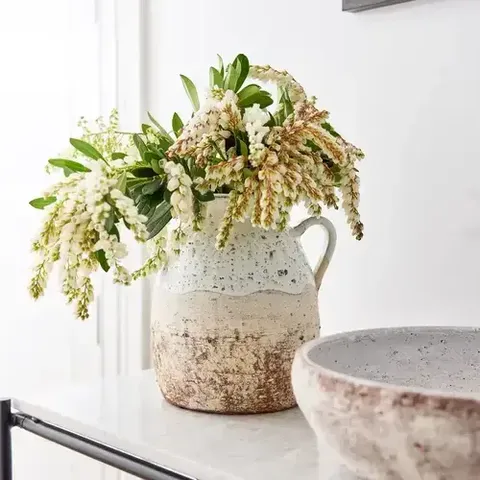 With a softly weathered glaze over earthy terracotta, this piece captures the raw beauty of stone worn smooth by time. Its surface is gently mottled and matte, full of quiet character and handmade depth. Part of the Pebbles and Glacier collection, it’s designed for relaxed, tonal styling across shelves, consoles or tabletop arrangements.